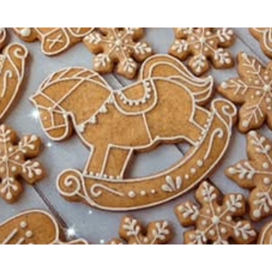 Hintaló körvonal sütikiszúró. Bedő Babett 2025-ös karácsonyi mézeskalács kínálata készült vele.